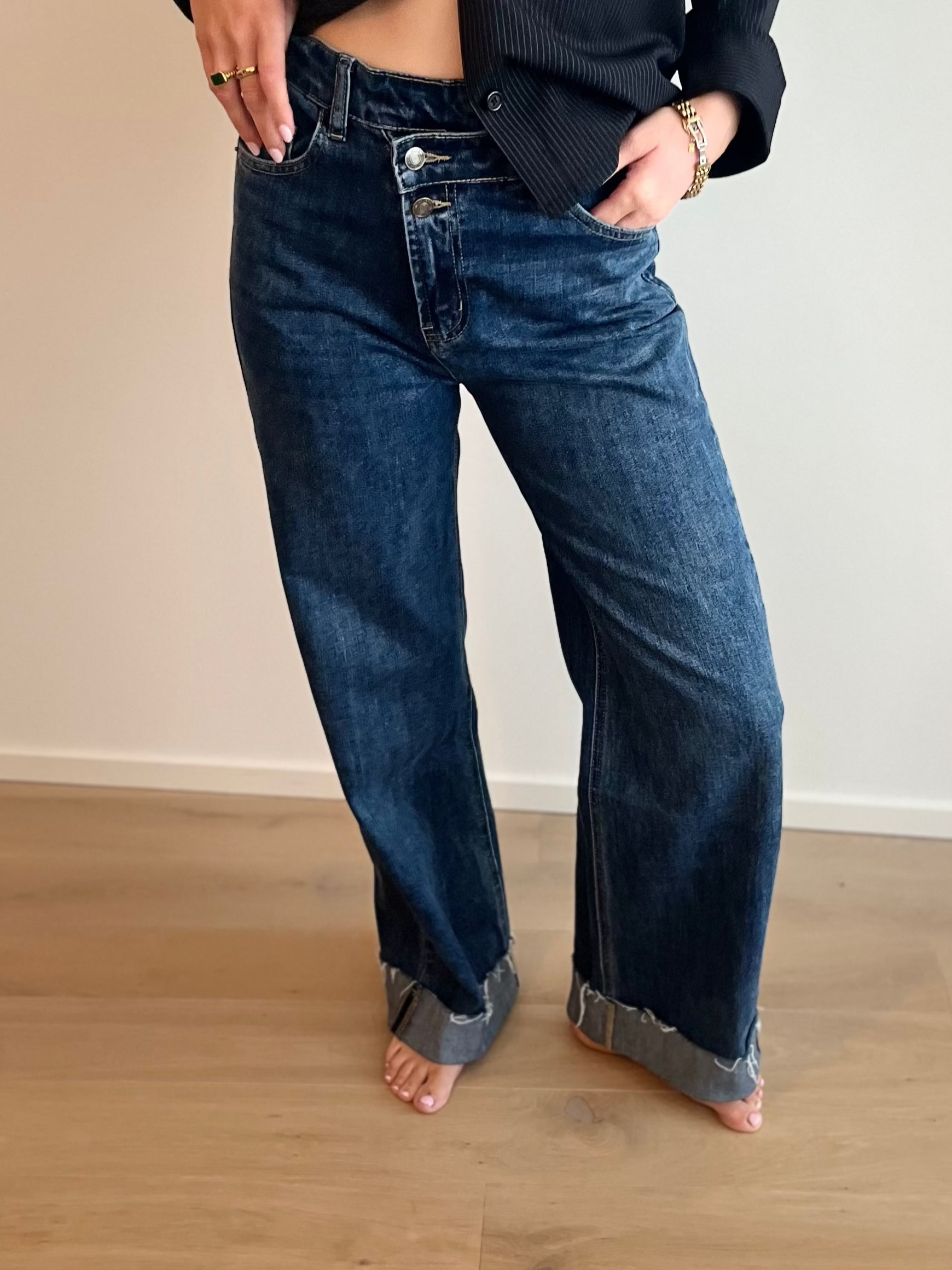 Our "Florence Wrap jeans" is comfortable by his stretchy fabric. With a high waist, wide leg bottoms with cuffs, it creates a flattering and fashionable look.