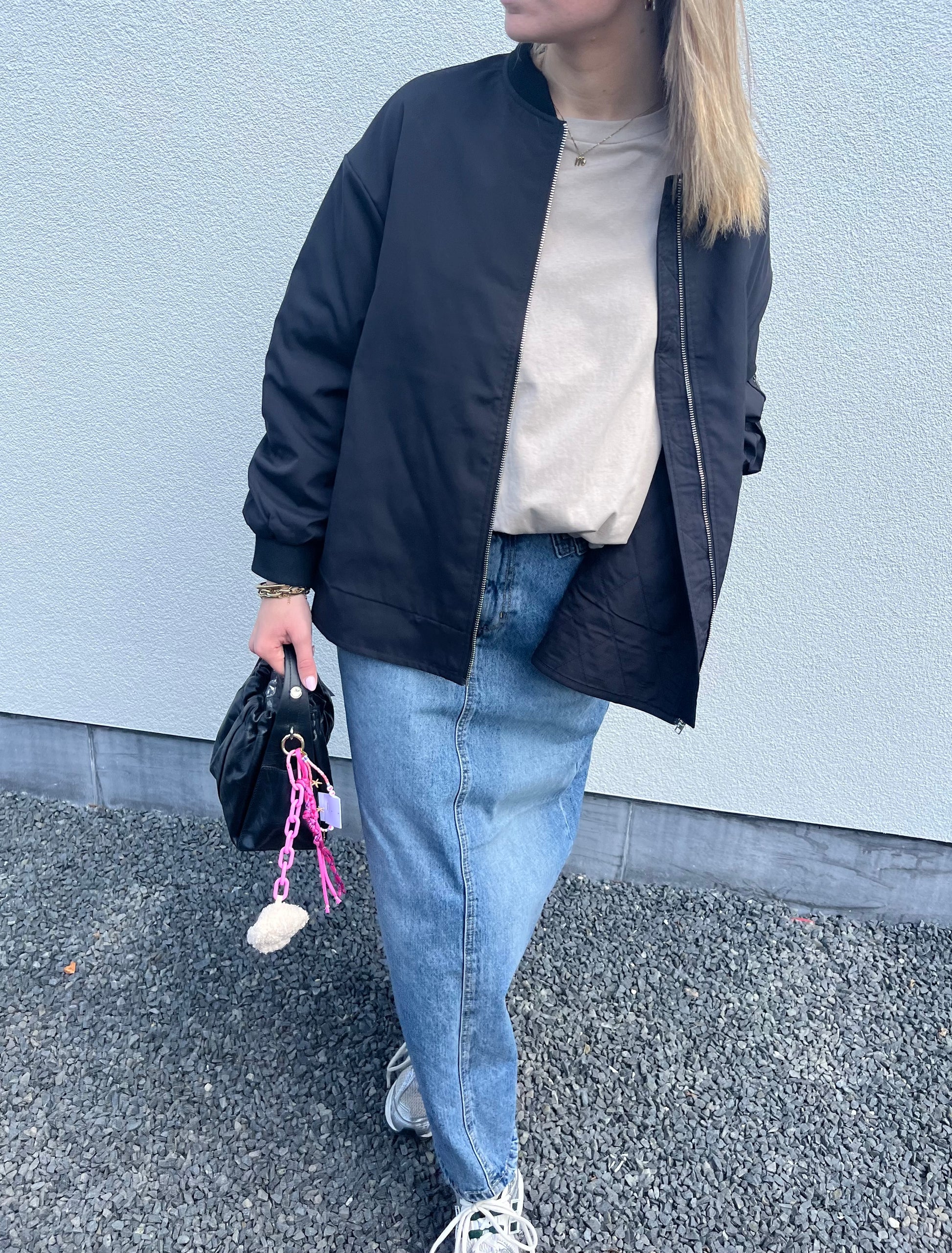 Our black "Juliette bomberjacket" adds a touch of edge to any outfit. It has an oversized fitting with slightly shorter sleeves. No bottom elastic for a relaxed look. Elevate your wardrobe with this must-have piece - Model 1m71. |