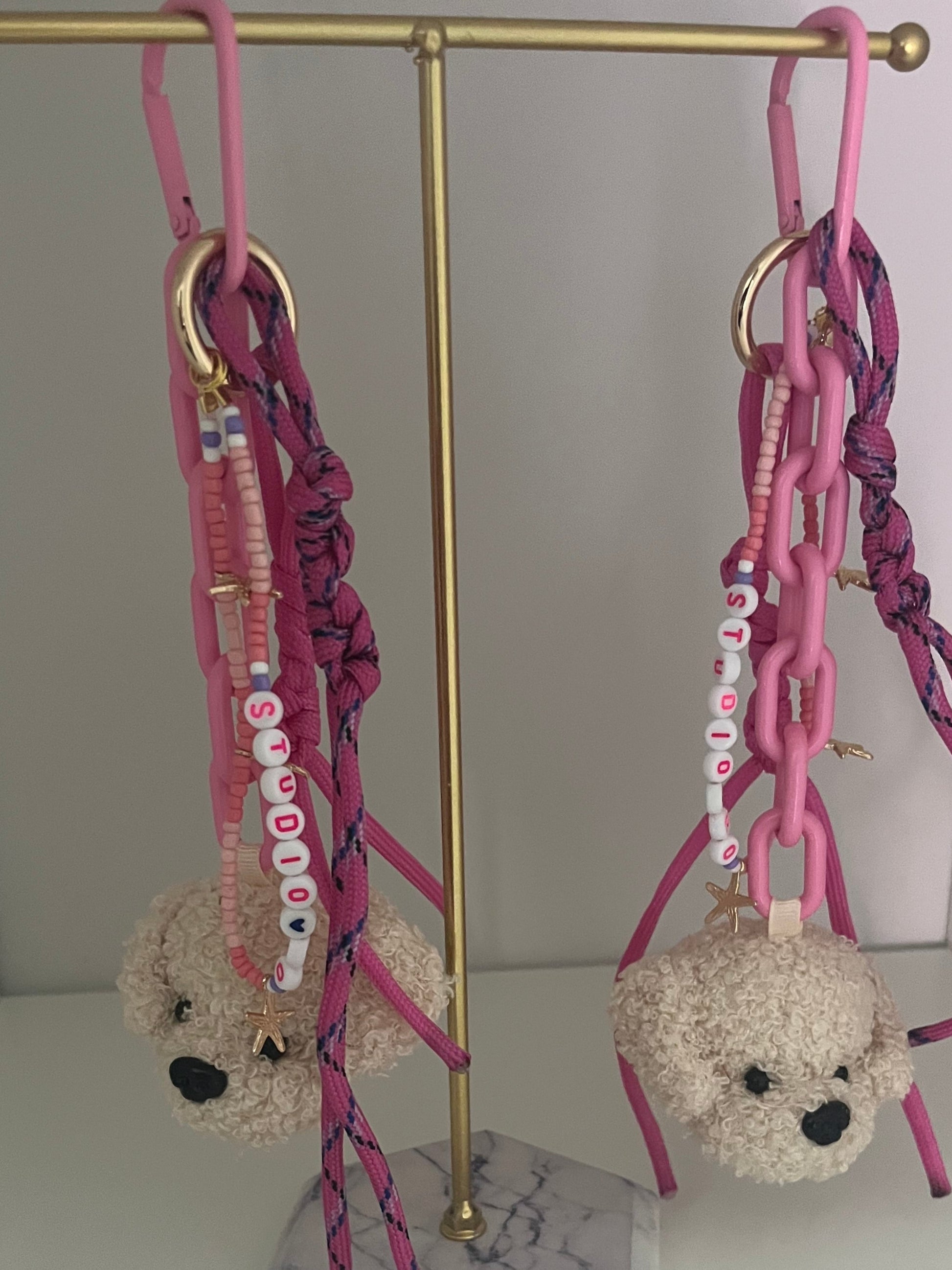 Add a touch of adventure to your bag or keys with this beige dog head pendant. With playful pink tones, it functions as both a bag hanger and keychain. Take a risk and express your unique style with this charming accessory! |
