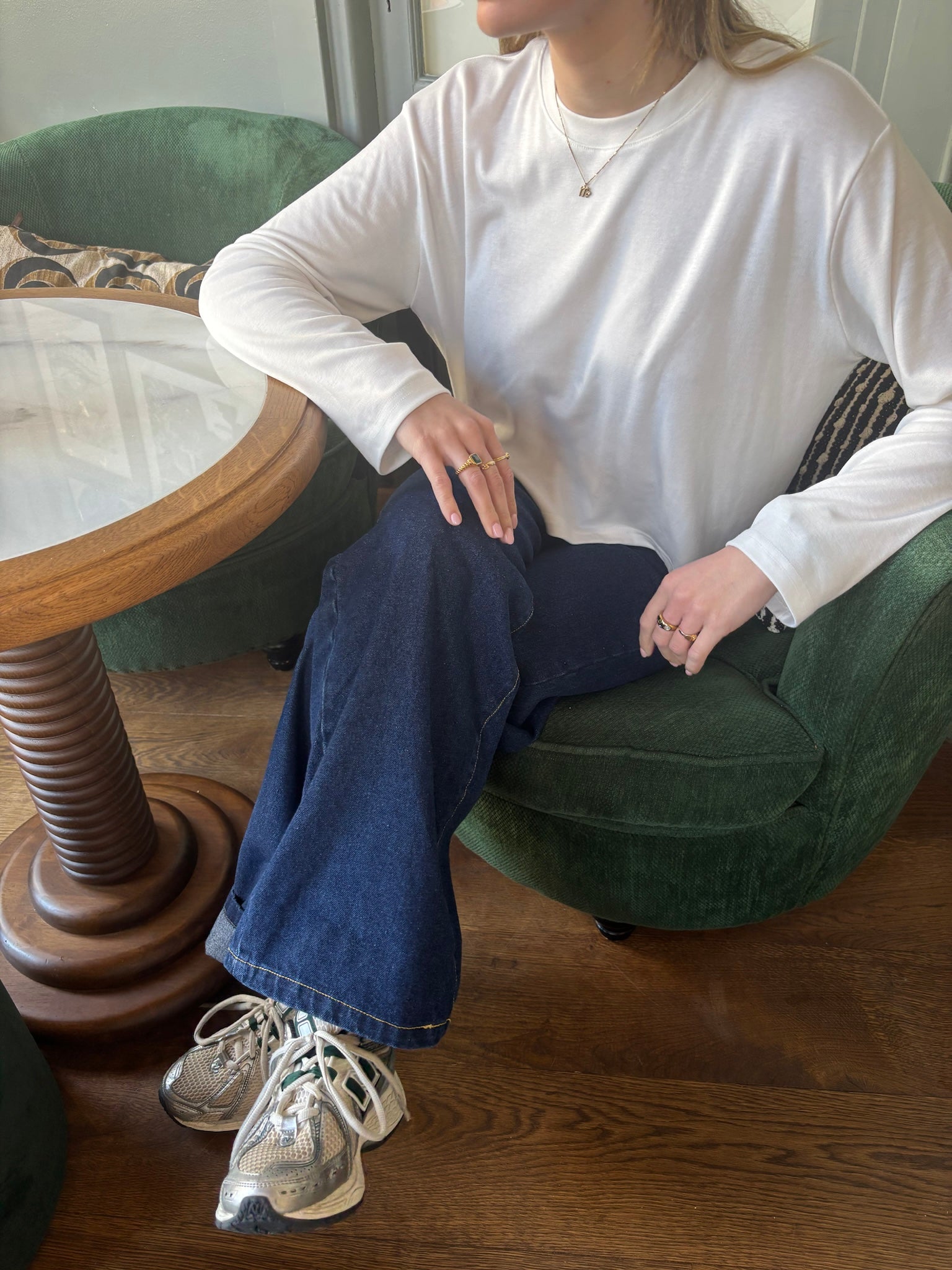 Jeans with contrasting stitching and five pockets in dark blue denim. Contrasting stitching.