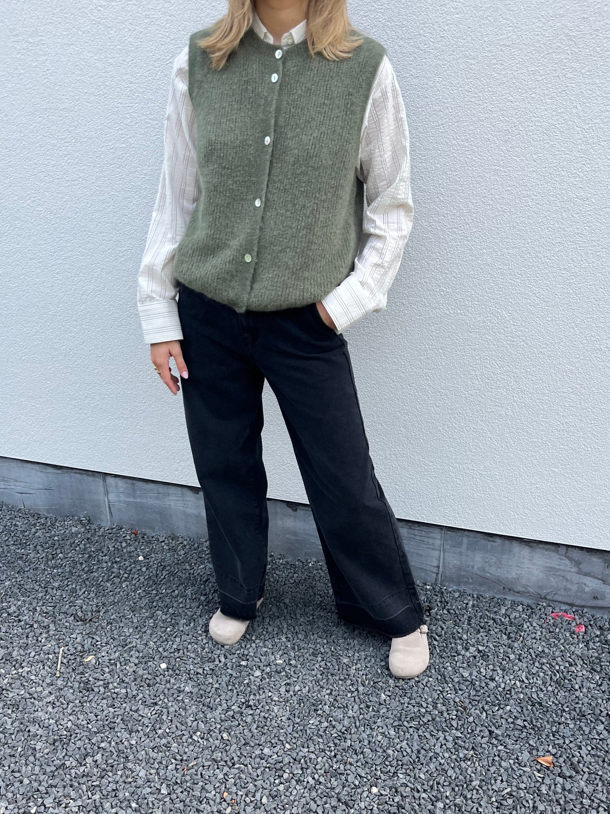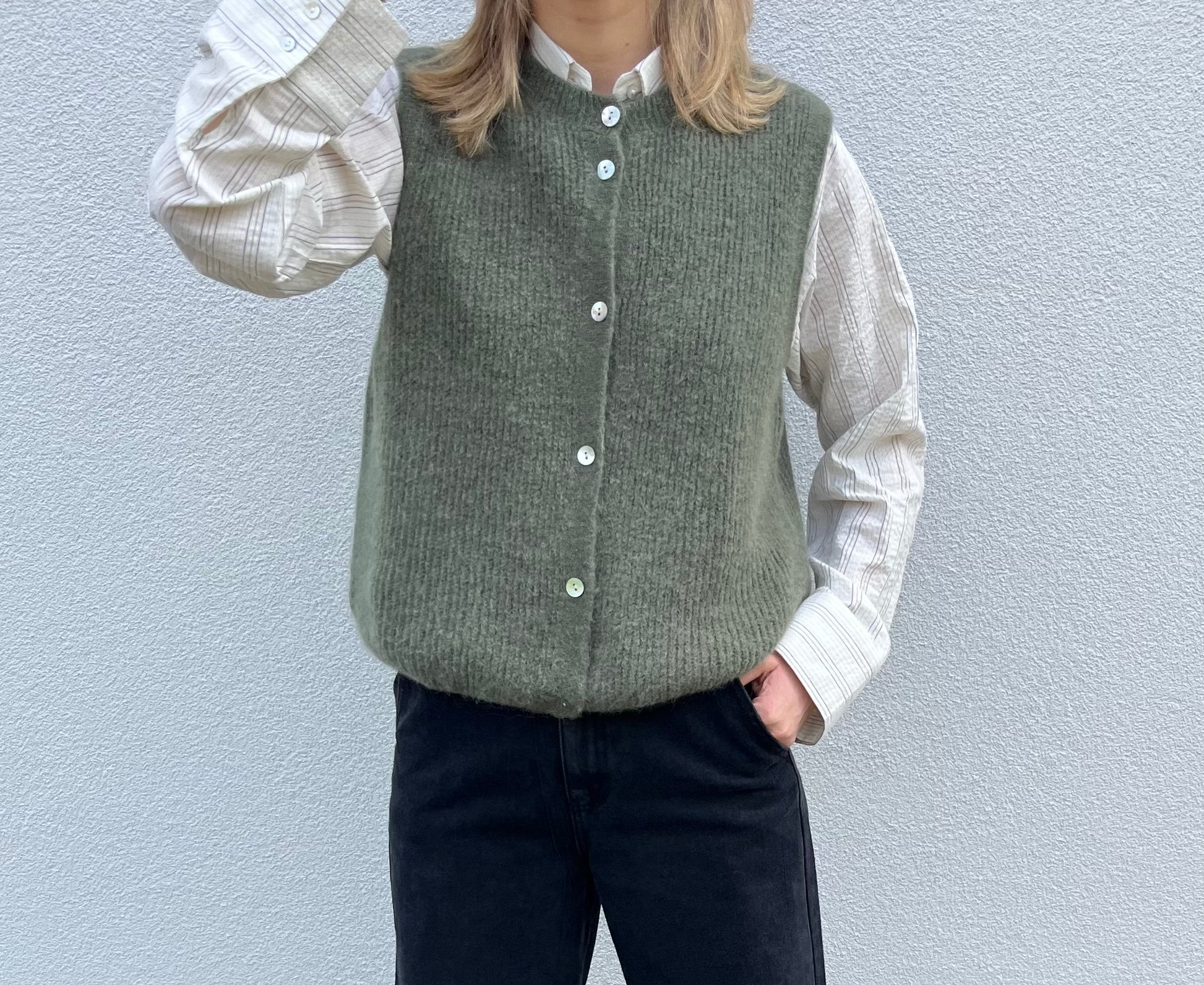 This sleeveless timeless khaki button-up knit is your new secret weapon